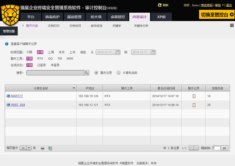 通过此功能可以有效了解员工的工作状态、控制企业文档,从而保障企业资产的安全。其中,聊天内容和邮件收发两部分为boss账户可见。