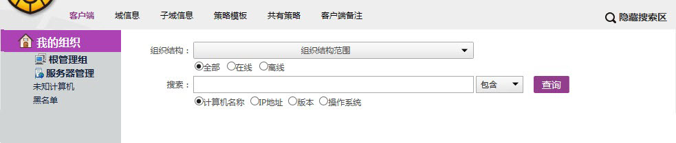 菜单栏主要包括【域信息】、【子域信息】、【策略模板】、【客户端】和【客户端备注】五个功能分区,在这里可以查看管理我的组织的基本信息、客户端和策略等相关内容。