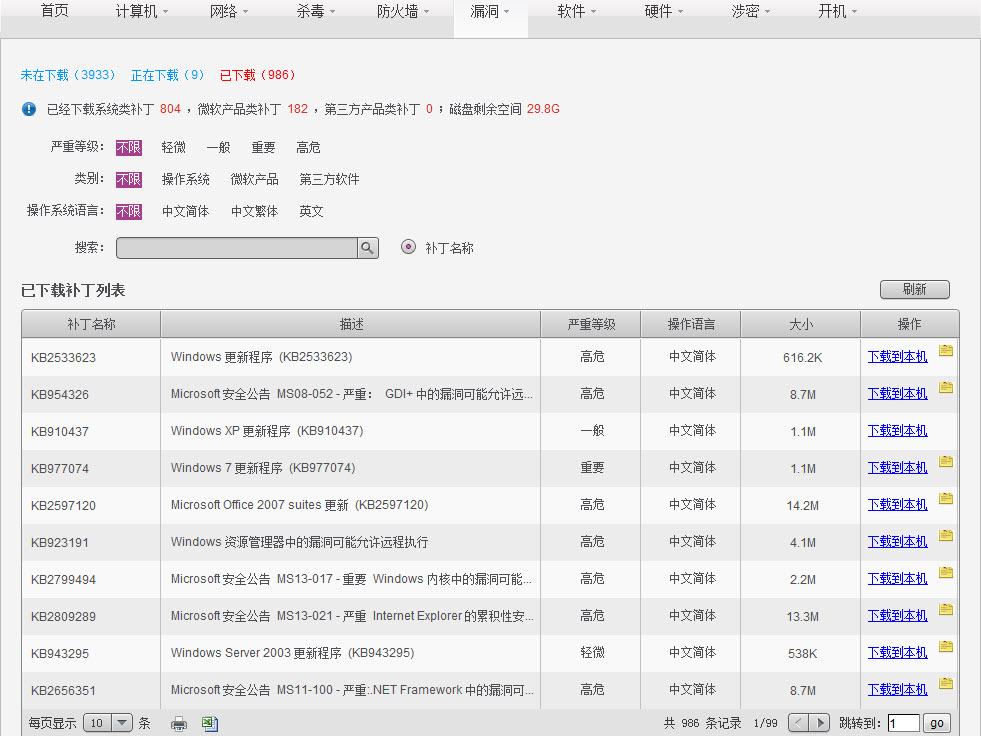 点击【已下载】,展示已下载补丁信息,包括补丁名称、描述、严重等级、操作系统语言和大小。