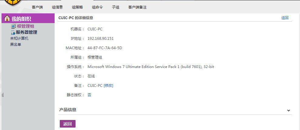 此界面显示的是此客户端的详细信息与产品信息。客户端的详细信息包括:机器名,IP地址,MAC地址,所属组,操作系统,状态,备注,静态授权这八个方面的信息。 产品信息,可以打开,查看具体信息。 一、 组信息 点击【组信息】在打开的界面中会列出父组、组名、最大容量和描述信息等信息。