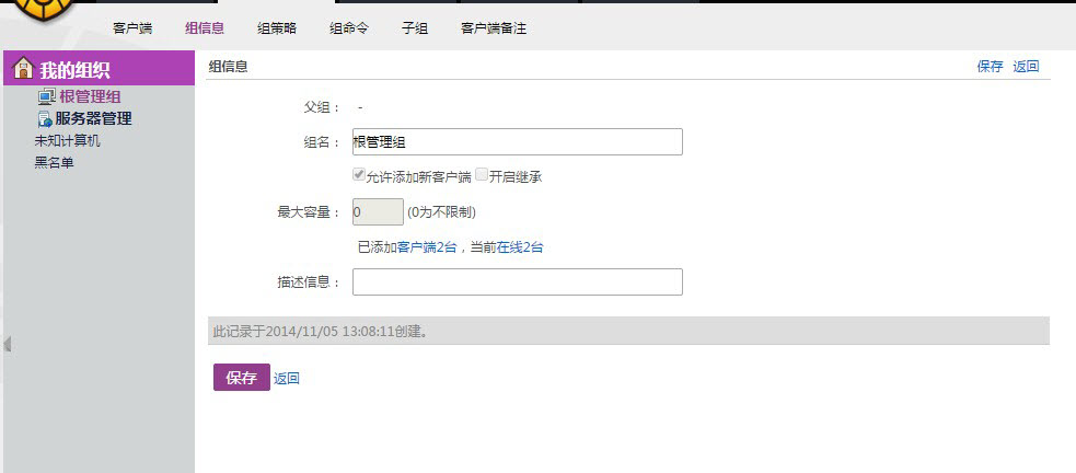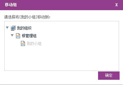 添加组:添加组的界面和组信息的界面是一致的,设置完【组名】、【最大容量】和【描述信息】之后点击【追加】即可。 移动到:将本组整体移动到其它组织,作为其下级组织存在。转移后,前若已勾选【开启继承】原策略失效,将全盘接受上级组织的策略;若未勾选【开启继承】将保留组原策略。