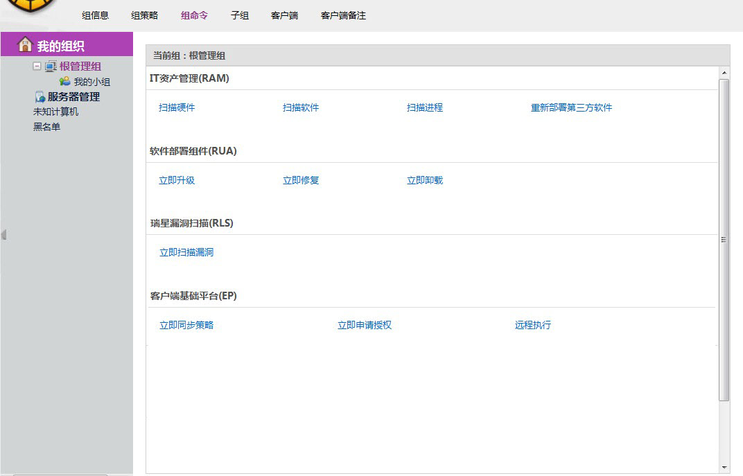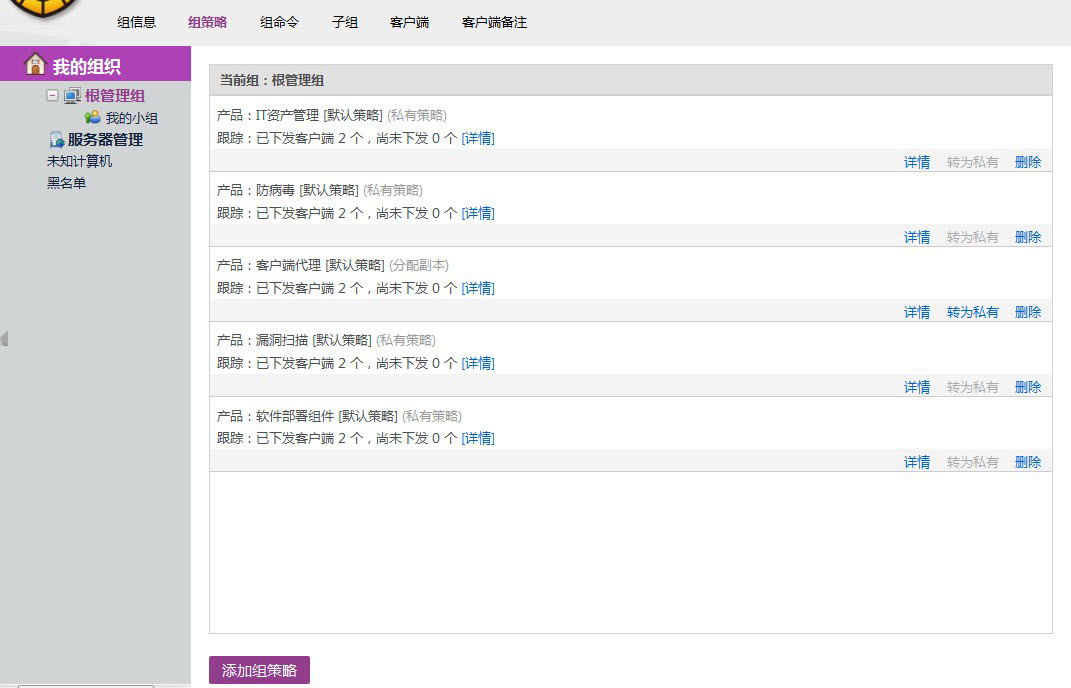 将鼠标放在策略上会显示出操作菜单。 详情:可以查看策略内容,也可以修改策略。 转为私有:策略来源可分为分配副本、继承副本和私有策略三种,只有策略为分配副本的时候可转为私有。转为私有以后,点击【详情】可修改策略。 删除:只有策略为【私有策略】时,【删除】按钮才有效。 添加组策略 点击界面左下角【添加组策略】可以为小组补充新的策略。 添加方法请参考本文档章节6.3.1.1.3.1 添加策略模板 三、组命令 命令客户端立即执行的内容。包括IT资产管理、软件部署组件、瑞星漏洞扫描和客户端基础平台等命令。