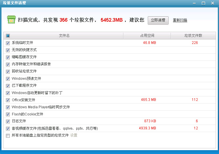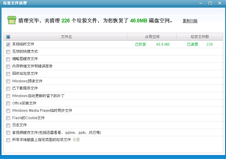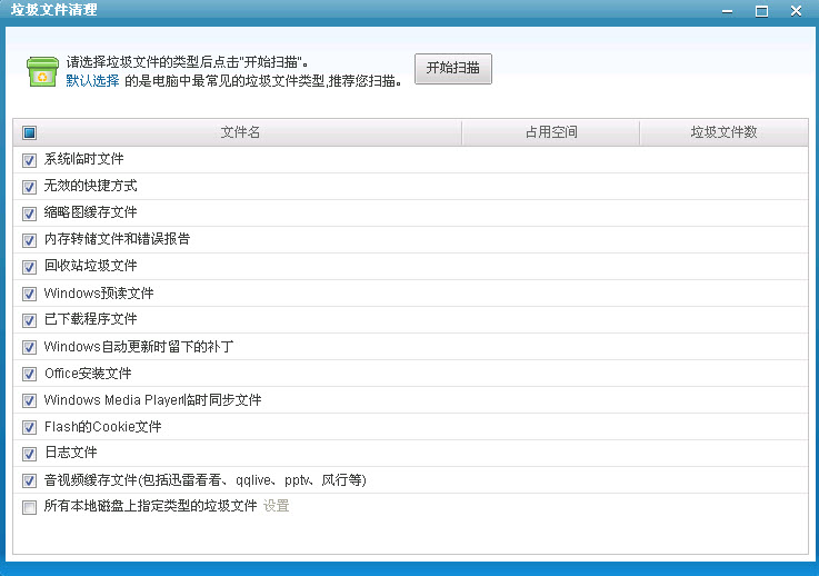 垃圾文件清理功能可以帮助用户扫描并清理电脑中的垃圾文件,默认选择的是电脑中最常见的垃圾文件类型,推荐用户扫描。