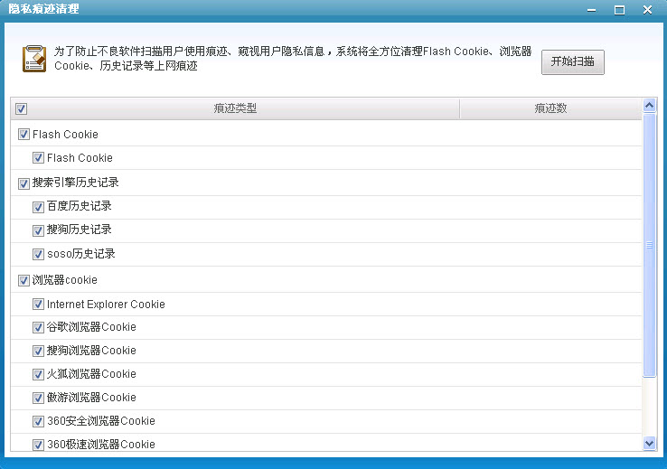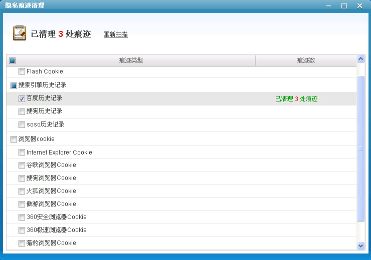 隐私痕迹清理功能为了防止不良软件扫描用户使用痕迹、窥视用户隐私信息,系统将全方位清理Flash Cookie、浏览器Cookie、搜索引擎历史记录等上网痕迹。