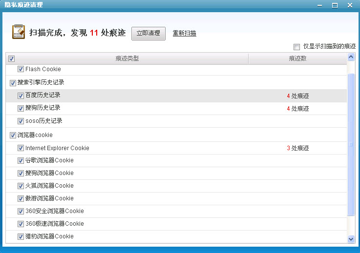 点击界面右上角的 ,系统则对痕迹进行扫描,扫描完成后,会显示隐私痕迹总数和详情,详情包括痕迹类型和痕迹数。用户可以勾选页面右上角的 ,则列表将隐藏未扫描到的痕迹类型。用户还可以点击 ,重新对痕迹进行扫描。