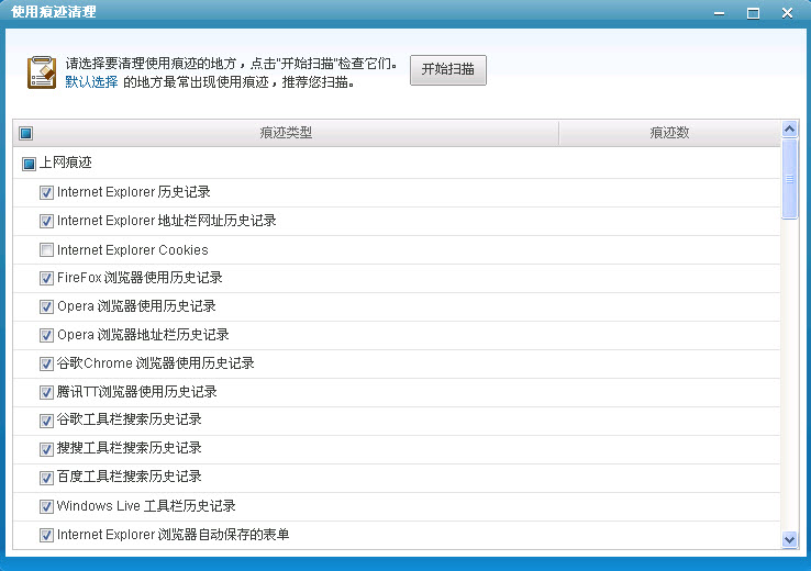 使用痕迹清理功能可以将用户的使用痕迹进行清理,默认选择的地方最常出现使用痕迹,推荐用户进行扫描。
