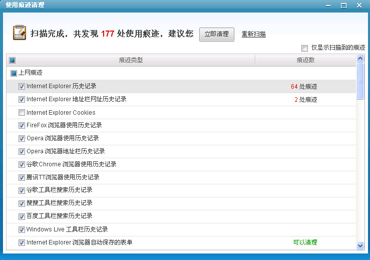 点击界面上方的 ,系统则对痕迹进行扫描,扫描完成后,会显示使用痕迹总数和详情,详情包括痕迹类型、痕迹数和清理状态。用户可以勾选页面右上角的 ,则列表将隐藏未扫描到的痕迹类型。用户还可以点击 ,重新对痕迹进行扫描。