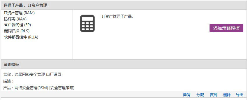 【策略模板】安全管理平台自带的预先设置的策略配置,企业可以根据自身需要选用、编辑或创建合适的模板并可统一分配至根管理组(普通组),以实现策略的快速统一分配。目前策略模板包括【IT资产管理(RAM)】、【防病毒(XAV)】、【客户端代理(EP)】、【漏洞扫描(RLS)】和【软件部署(RUA)】五个策略模板。 IT资产管理(RAM) IT资产管理属于企业的精细化管理范畴。 该子产品策略分为两部分内容【IT资产管理-默认策略】和【IT资产管理-软件部署策略】。用于扫描并记录客户端计算机的硬件信息,同时对硬件资产的变更也做详细的记录,通过单一控制台即可掌握整个企业的IT硬件资产信息;并且可以保护指定的软件、进程、以及服务,防止终端中运行的这些服务、进程被登录的用户强杀、删除、停止服务。这样可以做到企业内部的某些关键应用可以被有效的保护起来,而不被终端登录用户手动停止,或者第三方程序强制停止。 防病毒(XAV) 属于日常维护性管理范畴,能够在客户端计算机进行工作、上网等活动时,有效保护用户的个人数据不会被恶意程序窃取以及破坏。 客户端代理(EP) 该策略是基础性子产品,是其它子产品插件的基础。客户端代理不允许设置策略,本文档将不再详细介绍。 漏洞扫描(RLS) 该策略是负责扫描并修补客户端上的系统漏洞与应用程序漏洞。可为您提供全面的漏洞管理服务,可以帮助您杜绝主机层面或网络层面的威胁,从而阻止非法侵入或窃取,保障您的系统安全。 软件部署组件(RUA) 该策略是基础性子产品,负责更新升级客户端上的其它子产品。