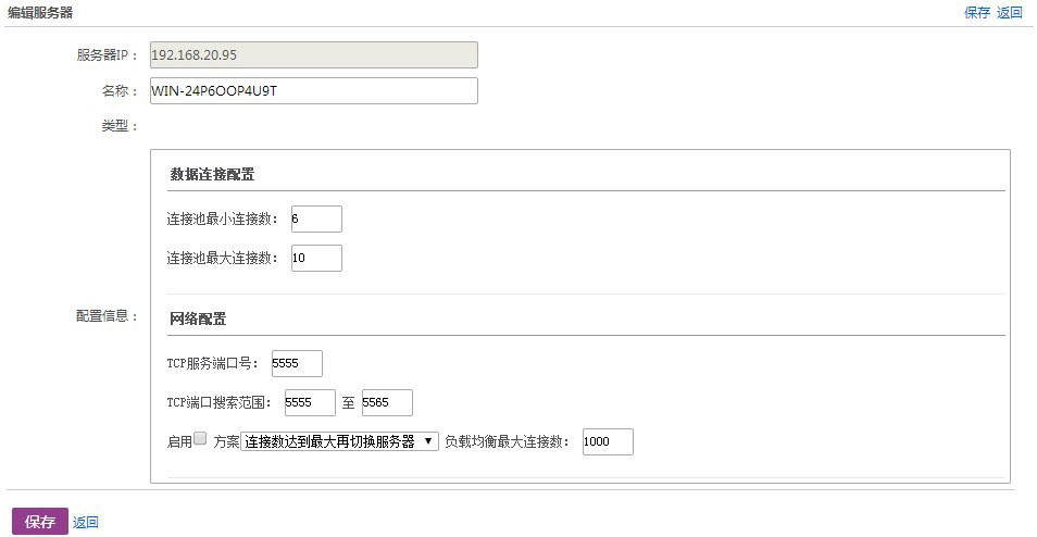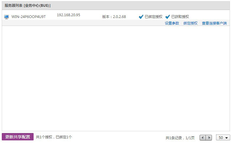 服务器IP:显示当前业务中心服务器的IP地址。 名称:输入服务器名称。 类型:显示当前服务器类型(即瑞星业务中心)。 配置信息:分为数据连接配置和网络配置两方面。 数据连接配置:输入连接池最小连接数和连接池最大连接数。连接池数高,响应的速度越快,但由于数据库连接池数有限,请合理分配资源。如不确定如何设置,可保留默认值。 网络配置:输入TCP服务端口号、TCP端口搜索范围以及负载均衡最大数。负载均衡最大数是指服务器所能承受的最大客户端连接数。在【更新共享配置】选项页中,如果勾选【负载均衡】功能,业务中心会自动根据各业务中心服务器的负载均衡最大连接数,按负载均衡最大连接数比例自动分配连接,达到调节服务器负载,合理利用服务器资源的目的。 2. 绑定授权 点击【绑定授权】打开【服务器授权绑定】。