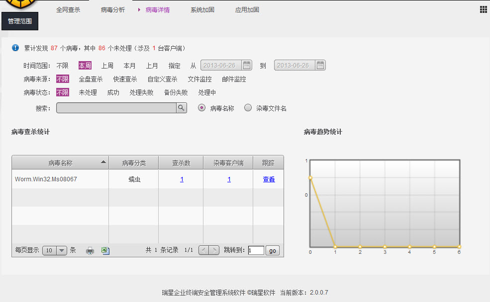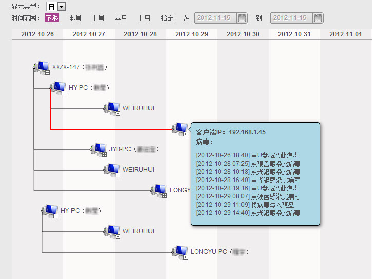 点击病毒跟踪查看链接,显示相应病毒跟踪信息,包括病毒爆发的起始时间、传播路径和客户端感染过程记录。