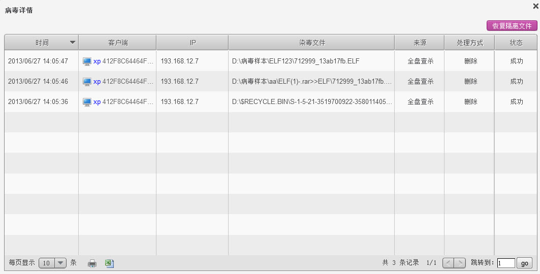 点击查杀数链接,弹出病毒详情信息,包括时间、客户端、IP、染毒文件、来源、处理方式和状态。可以点击【恢复隔离文件】将所有客户端的隔离文件恢复到指定位置。