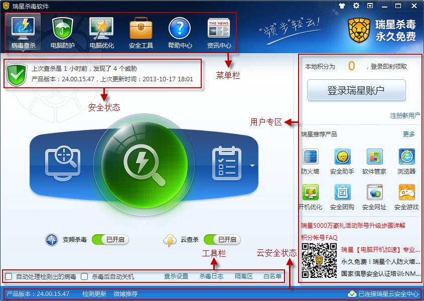 菜单栏:六个标签页面,分别是【病毒查杀】、【电脑防护】、【电脑优化】、【安全工具】、【帮助中心】和【资讯中心】。 安全状态:显示当前电脑的安全状态信息,包括最近查杀时间、威胁个数、产品版本更新信息等。 工具栏:用于进行菜单操作的窗口,包括查毒后处理选项、【查杀设置】、【杀毒日志】、【隔离区】和【白名单】。 云安全状态:该区域显示的是当前电脑的云安全的状态、产品版本,点击【检测更新】当有新版本时软件会自动更新,点击【微博推荐】进行社交网络互动。 用户专区:显示瑞星账户相关操作和资讯展示。