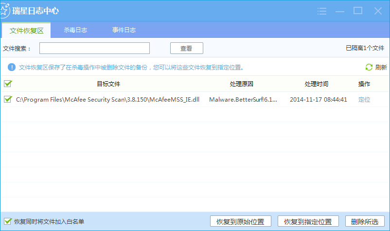 【文件恢复区】保存了在杀毒操作中被删除文件的备份,您可以在这里勾选这些文件将其恢复到原始位置或者指定位置,也可以将其删除。在恢复这些文件的同时,您可以勾选左下角选项将其同步加入到白名单中,这样再次杀毒时不会再对其进行操作。在文件较多时,您也可以使用【文件搜索】功能精确定位到具体文件。