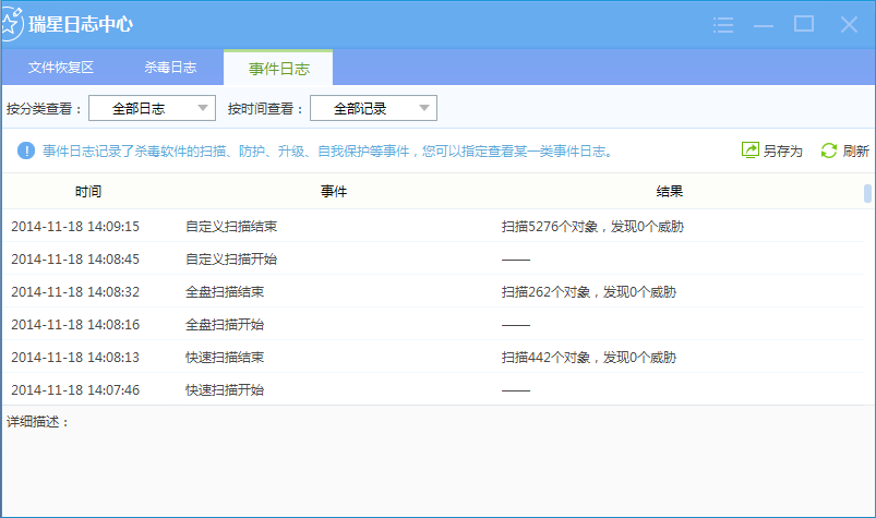 【事件日志】记录了杀毒软件的扫描、防护、升级、自我保护等事件日志。您可以点击【另存为】将日志以*.txt/*.xls格式备份到本地。查看条件分为【按分类查看】和【按时间查看】,设定具体的查看条件查看相应日志。