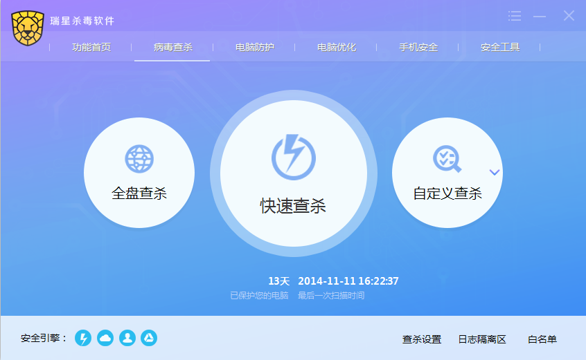 打开瑞星杀毒软件主程序界面,点击【病毒查杀】图标按钮,进入病毒查杀界面。瑞星杀毒软件为您提供了多种方便快捷的查杀方式,包括:【全盘查杀】、【快速查杀】和【自定义查杀】。