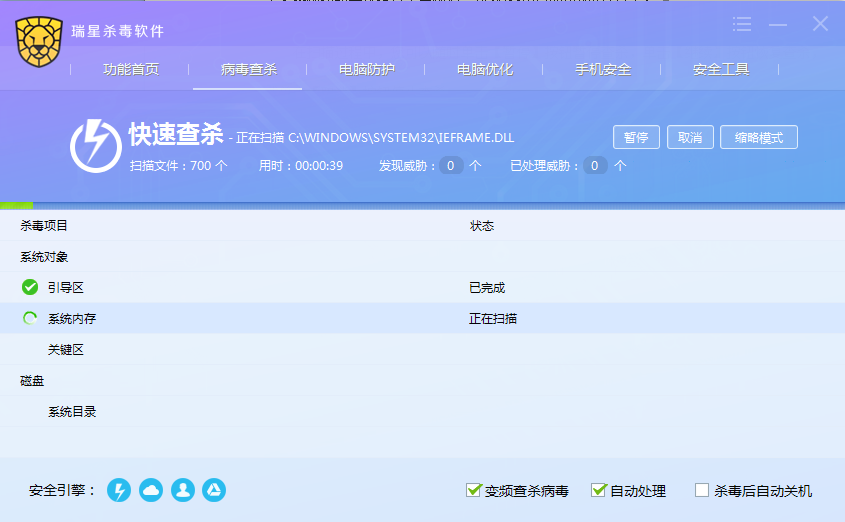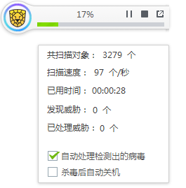 若勾选【自动处理】则一经发现病毒杀毒软件会自动处理。勾选【杀毒后自动关机】,电脑会在杀毒操作结束后自动关闭。