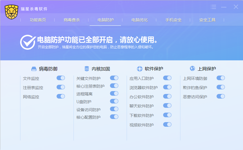 瑞星电脑防护包含【病毒防御】、【内核加固】、【软件保护】、【上网保护】四大核心功能,其各自又包含不同的功能子项。