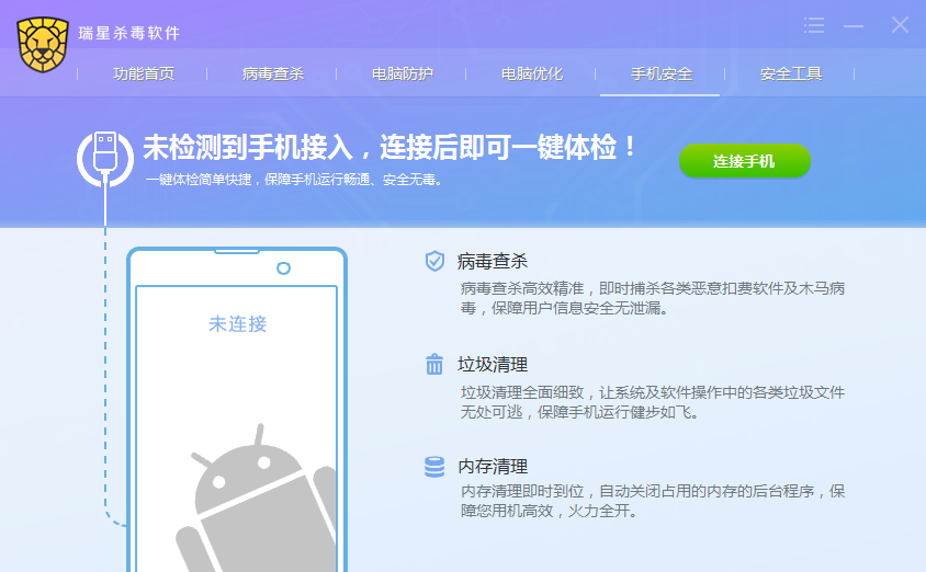 点击瑞星杀毒软件主程序界面的【手机安全】图标按钮,进入手机安全界面。