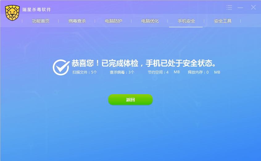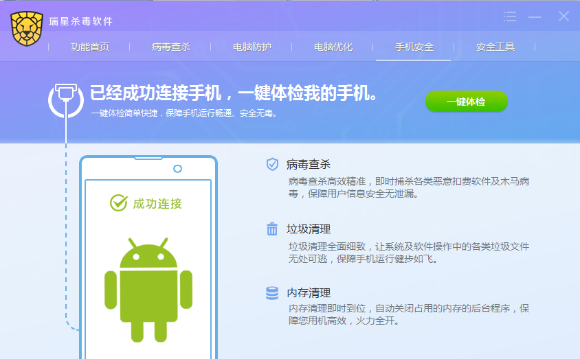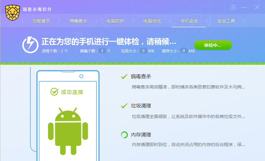点击【一键体检】按钮,便直接启动手机端瑞星安全助手软件,对手机进行病毒查杀、垃圾清理和内存清理。体检完成后使手机处于安全状态。