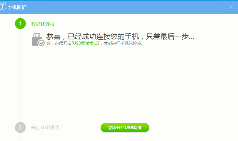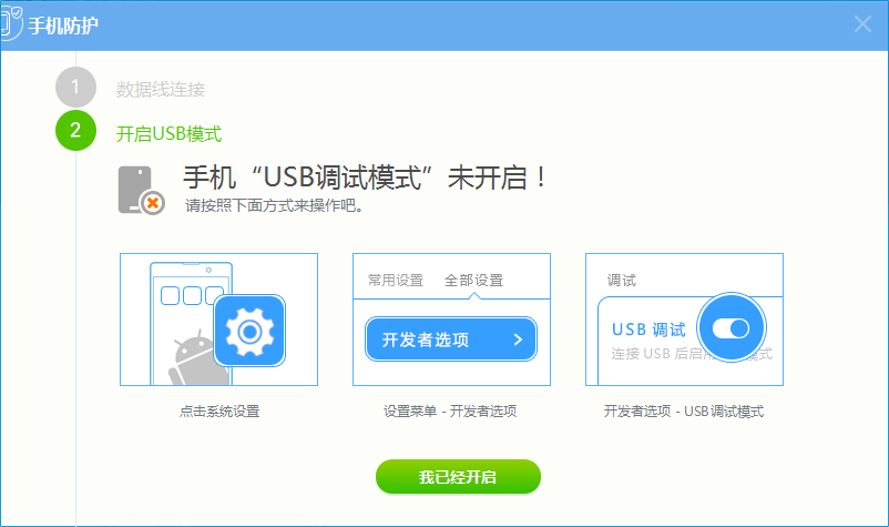 1.重新插拔数据线或者更换USB接口,确认接触良好后点击【完成以上步骤】。数据线连接成功后,杀毒软件会提示您开启USB调试模式,点击【立即开启USB调试】按钮。