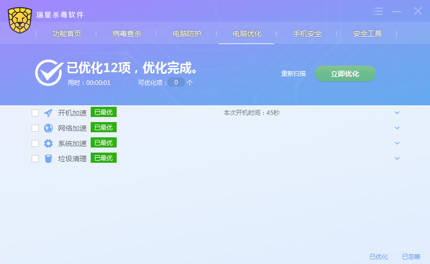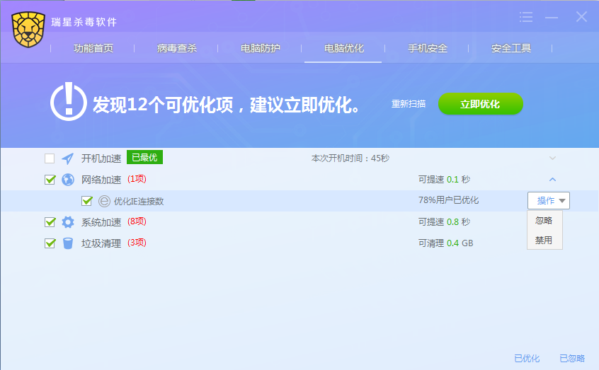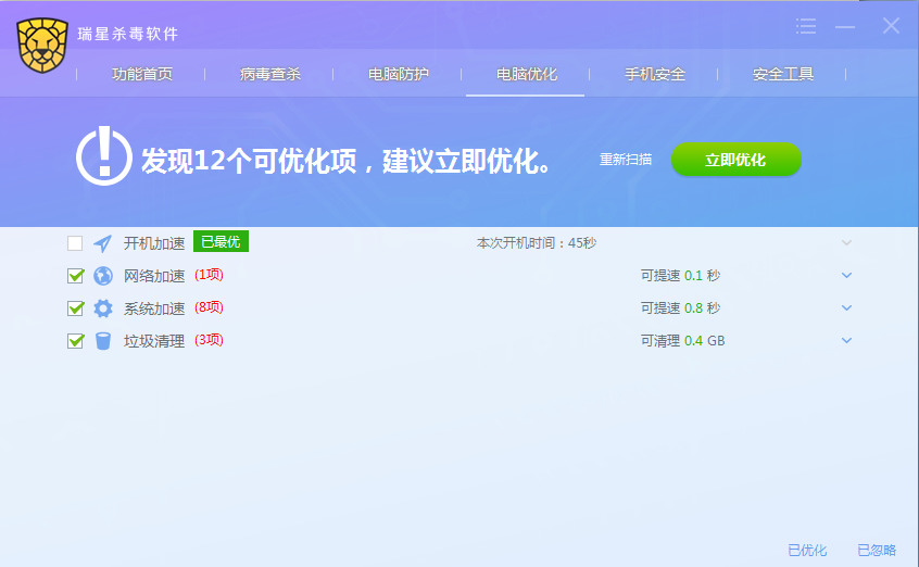 进入杀毒软件主程序界面,点击【电脑优化】图标按钮即开始对电脑进行扫描,扫描完成展示可优化项目列表。