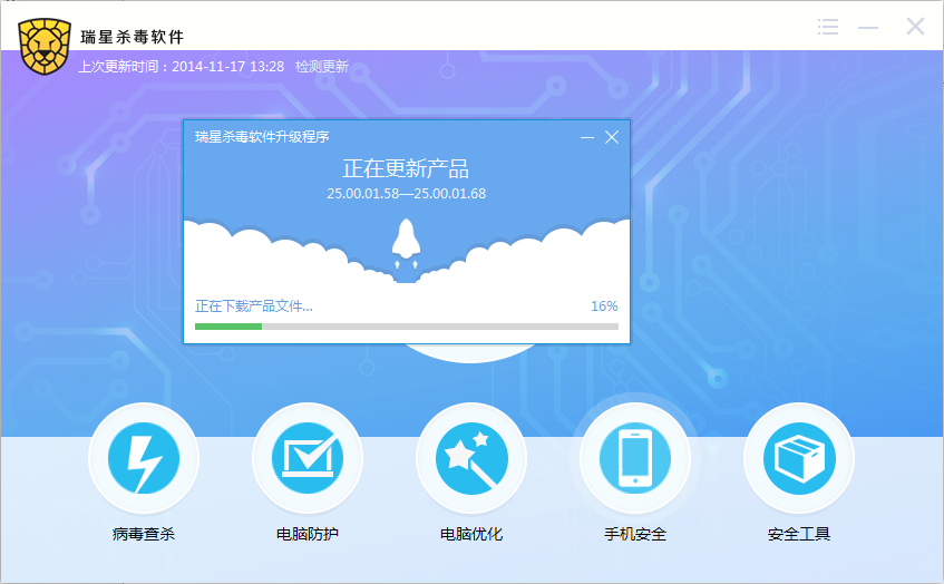 您可以点击主界面上部的【检测更新】,瑞星杀毒软件将自动更新到最新版本。
