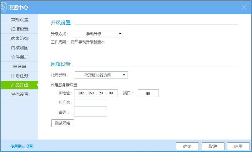 【网络设置】成功后,您就可以通过点击瑞星杀毒软件主程序界面中的【检查更新】按钮进行升级了。 您也可以通过点击【测试网络】按钮,以测试网络连通性。